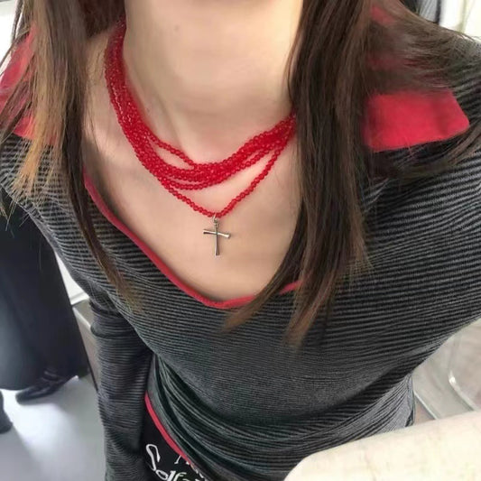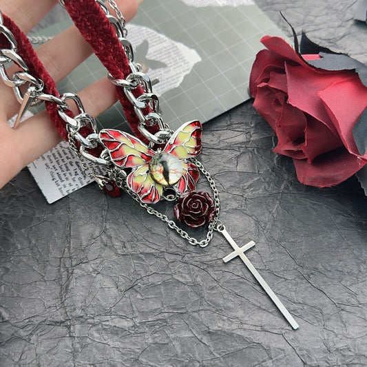 Crimson Cross Choker | Gothic-Nocturne Doctrine, Butterfly-Delicate Wings, Y2K-Cyber Cutie, Sparkle-Crystal Kiss Style